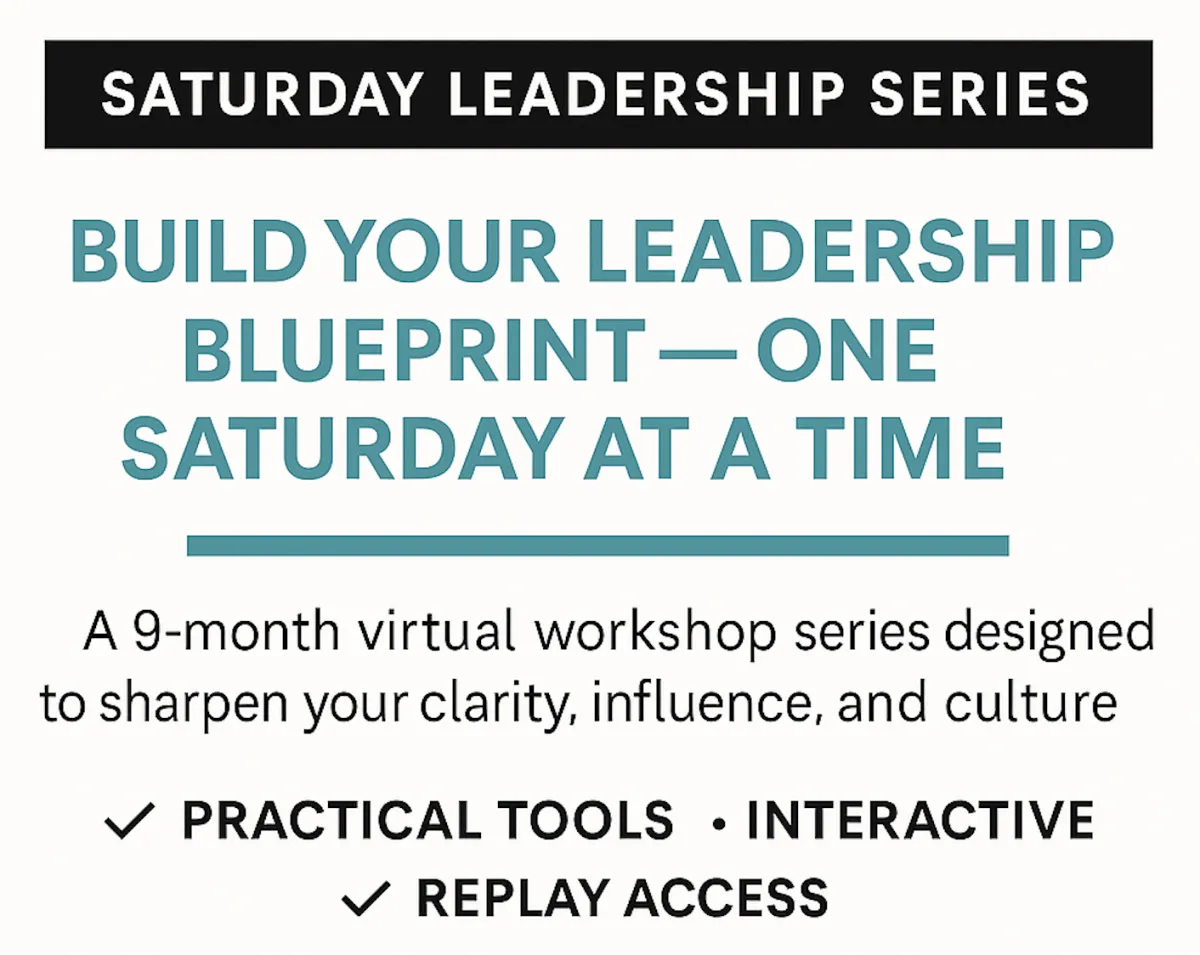 Join the Saturday Leadership Series — 9 monthly, 90-minute virtual workshops designed to help you design systems, shift your influence, and lead with resilience in a changing world.
